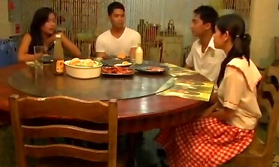 Two Japanese girlfriends invite boys for hot group sex